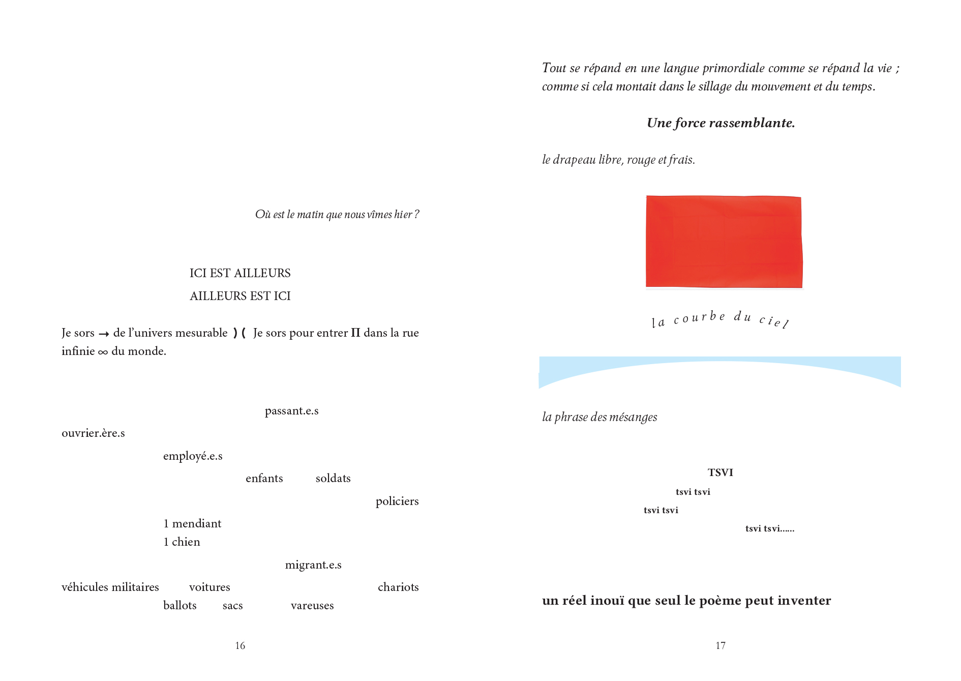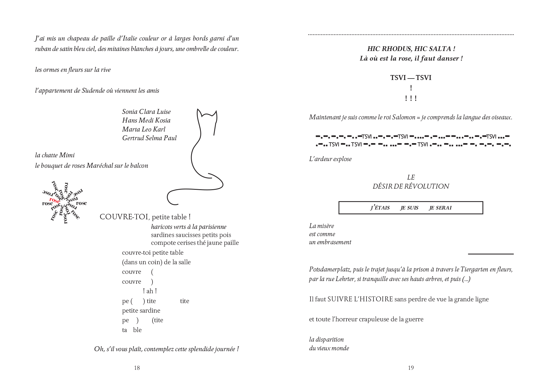 Dans ce poème texto-visuel, Denise Le Dantec convoque Rosa Luxemburg qui, malgré la violence des luttes, les multiples déceptions et les emprisonnements, n'a jamais cessé de croire en la nécessité des luttes émancipatrices. « Malgré la neige, le froid et la solitude, nous croyons – les mésanges et moi – au printemps à venir ! » écrit-elle, dans sa cellule.