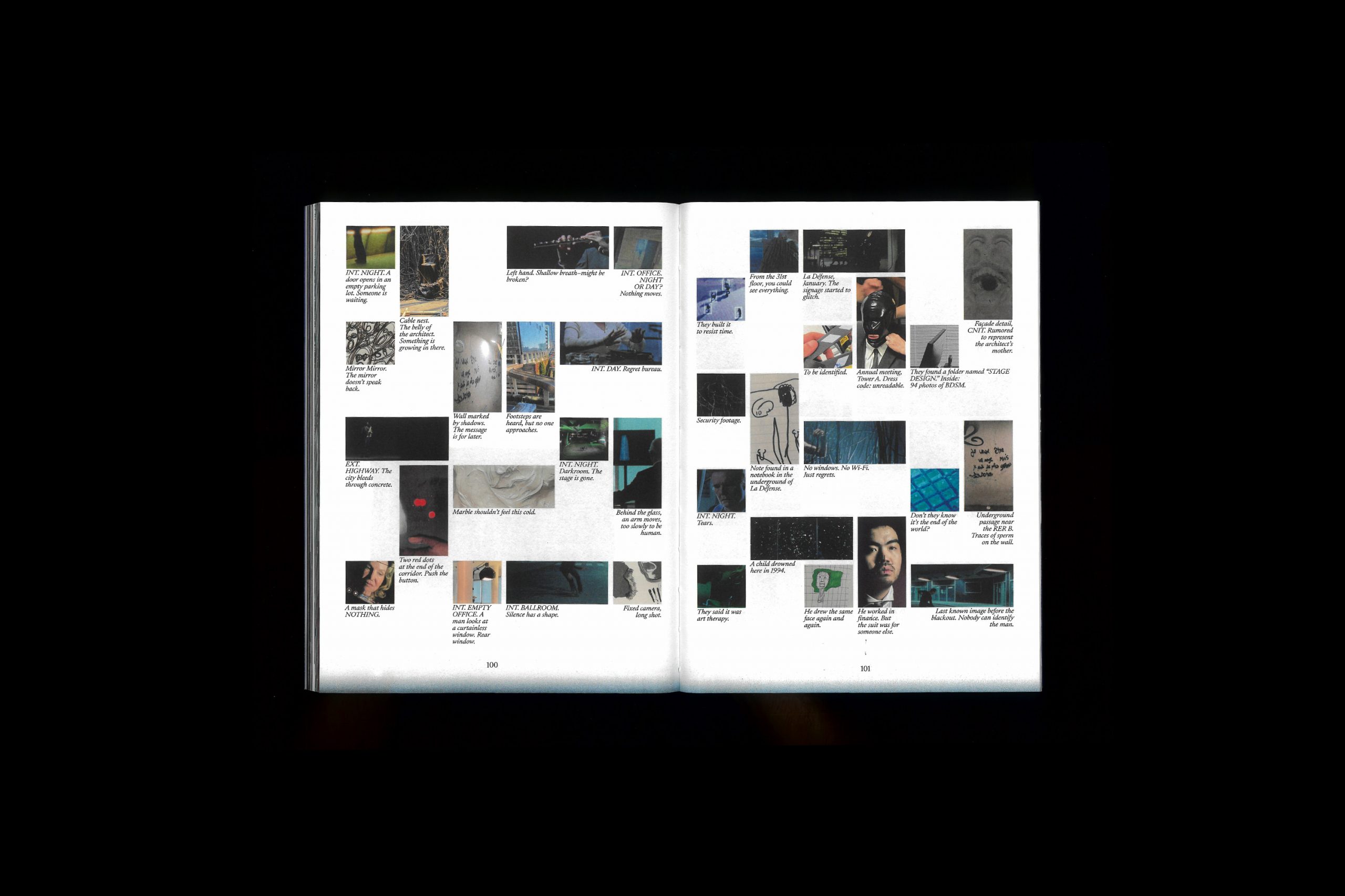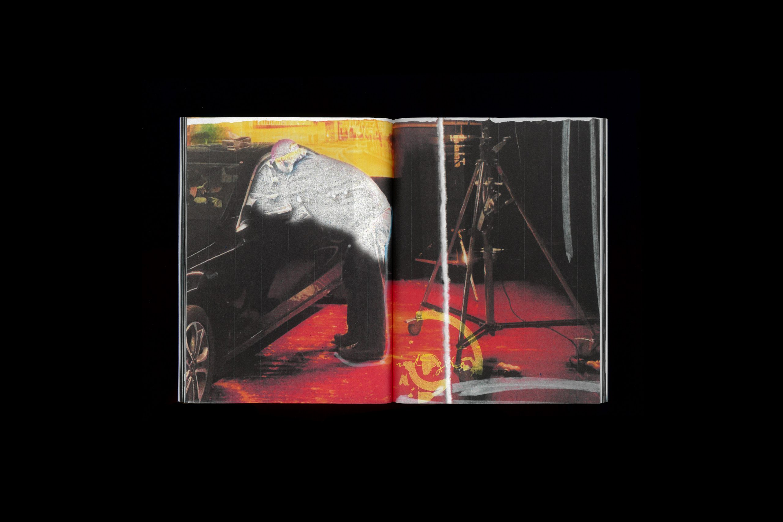 Interzone is an artist's book published on the occasion of Valentin Noujaïm's first institutional solo exhibition, Pantheon, taking place at Kunsthalle Basel. It accompanies the premiere of the work La Défense Volume III – Demons to Diamonds and brings together for the first time the artist's complete La Défense trilogy (2022–25). Edited by Mohamed Almusibli and conceived by Noujaïm and graphic designer Kim Coussée, the volume contains extensive documentation of the trilogy's development—film stills, analog photographs, archival materials—to offer glimpses behind the scenes of the artist's collaborative process. Its nonlinear sequences create new dialogues across the trilogy and extend the exhibition's spatial logic into print. This volume is thus both an extension of the exhibition and an autonomous work, providing an immersive entry point into Noujaïm's cinematic world.