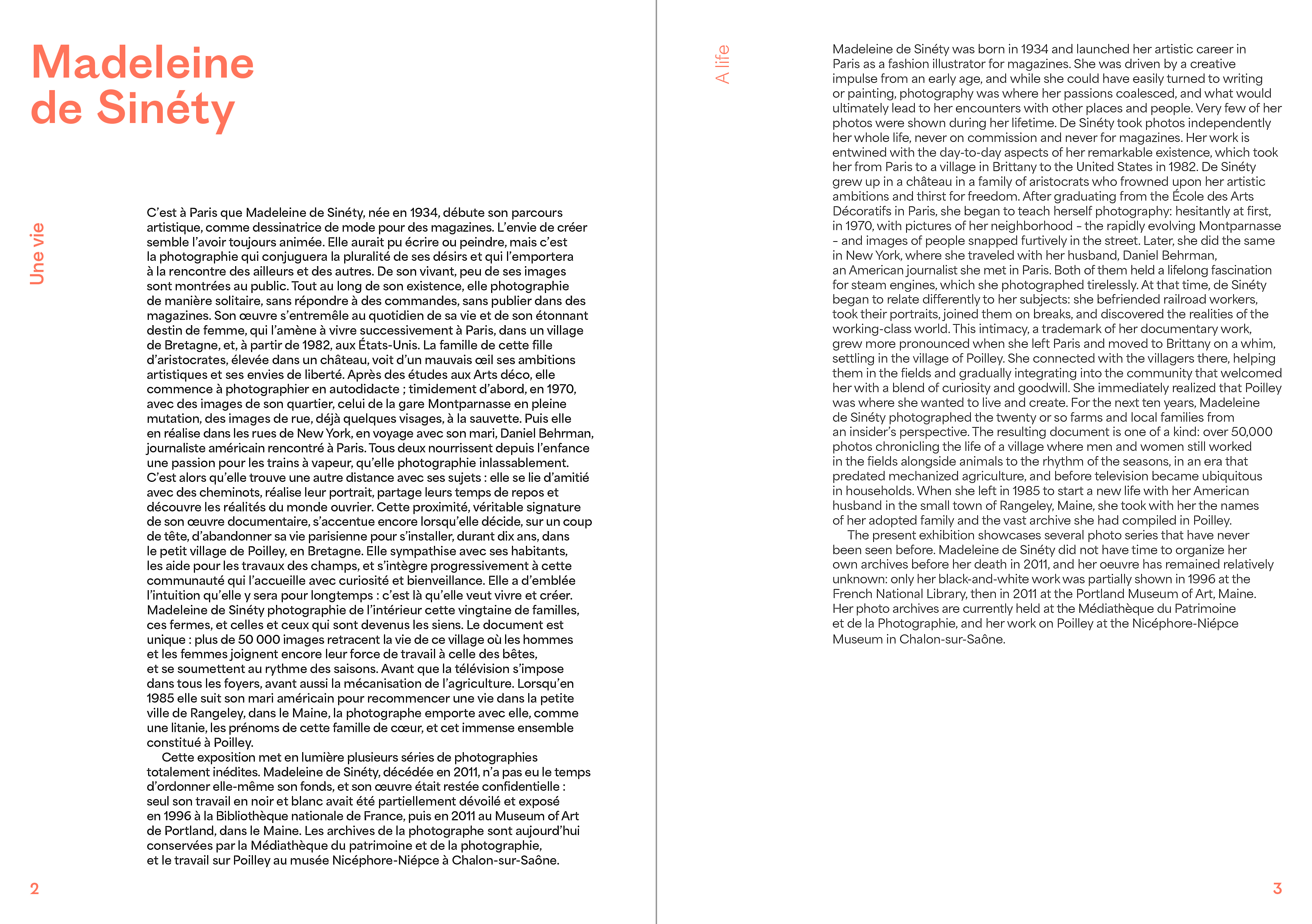 Fille d'aristocrates, Madeleine de Sinéty trouve son émancipation dans la photographie, qui la mène à la rencontre des ailleurs et des autres. À partir des années 1970, elle documente d'un œil sensible les mutations des quartiers de la gare Montparnasse à Paris et de Manhattan à New York, tandis qu'elle réalise un reportage sur les derniers trains à vapeurs, grâce aux liens noués avec des cheminots. La proximité avec ses sujets devient dès lors sa signature. Les milliers d'images de Poilley (1972-1991), son leg majeur, résultent d'une immersion dans le mode de vie de ce village breton, où les paysans joignent encore leur force de travail à celle des bêtes. L'artiste partage le quotidien des familles, aidant aux travaux des champs, son appareil photo au cou. Ses clichés en noir et blanc de Rangeley, dans le Maine, où elle s'installe en 1985, disent encore l'humanité et la tendresse de son regard singulier. À travers 60 images pour nombreuses inédites, cet album offre une plongée dans l'œuvre de la photographe, à laquelle s'entremêle son étonnant parcours de vie.