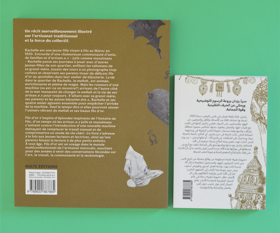 L'ouvrage Fils d'or écrit par Ariella Aïsha Azoulay s'adresse à la fois aux jeunes lecteurs et lectrices et aux plus grands. Le récit, illustré par Hagar Ophir, s'inspire d'un temps où les artisan.es juifs et musulmans de Fès s'unirent pour protéger leur communauté vivant au sein du mellah, le quartier juif. Une histoire sur l'artisanat traditionnel et la force du collectif, pour raviver la mémoire d'un monde perdu.