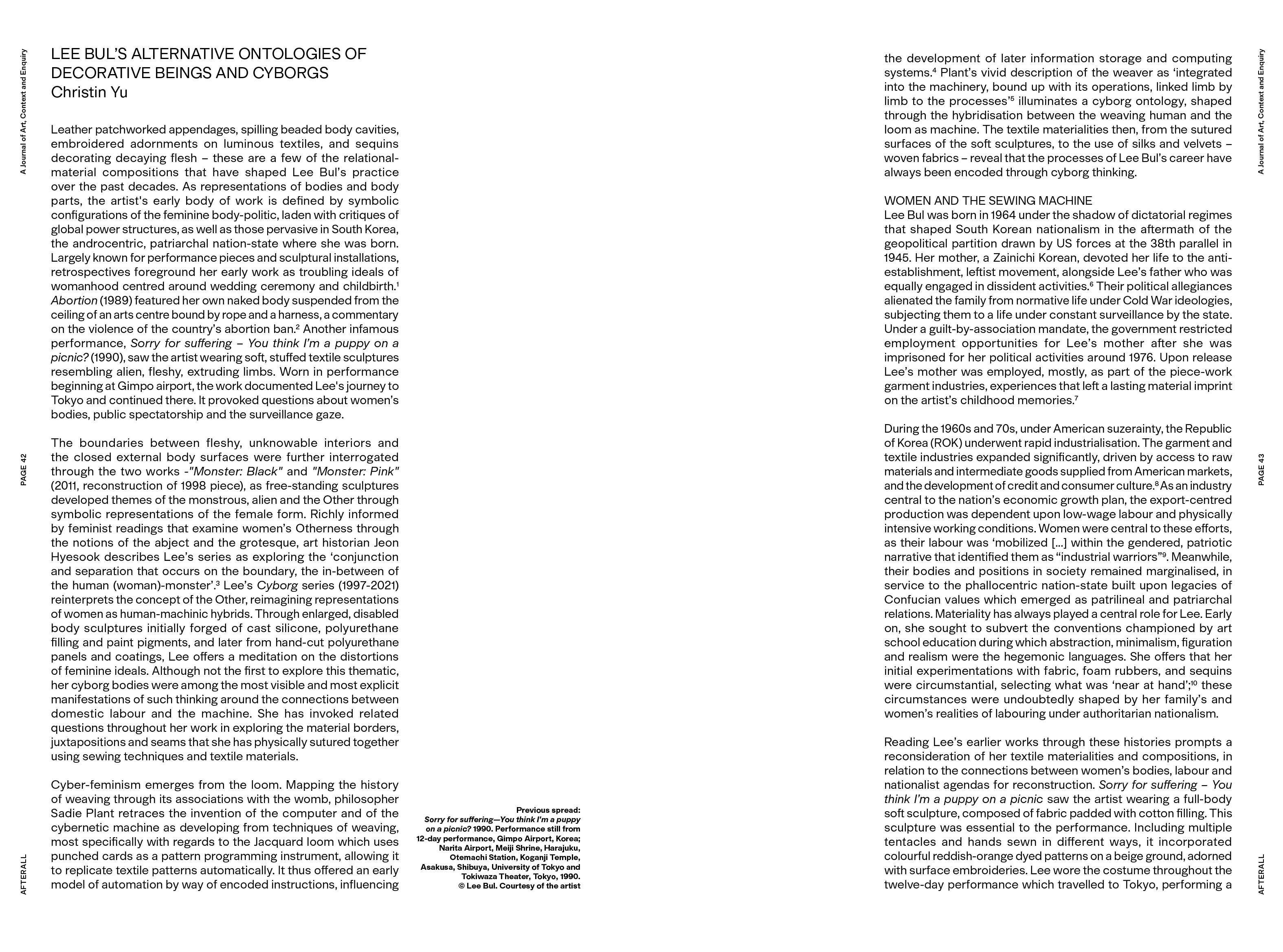 Explorant un éventail de technologies disparates – allant de l'IA et des cyborgs à la bio-ingénierie et au surf – ainsi que divers contextes géoculturels, ce numéro comprend des contributions de Li Qi, Ingrid Pui Yee Chu, Christin Yu, Filipa Ramos, Joël Vacheron, Nicolas Vamvouklis et Dorota Jagoda Michalska. Il met en lumière le tarvail des artistes Lawrence Lek, Lee Bul, Revital Cohen et Tuur Van Balen, Sojung Jun, Im Heung-soon, Flaka Hality et Kateryna Lysovenko.