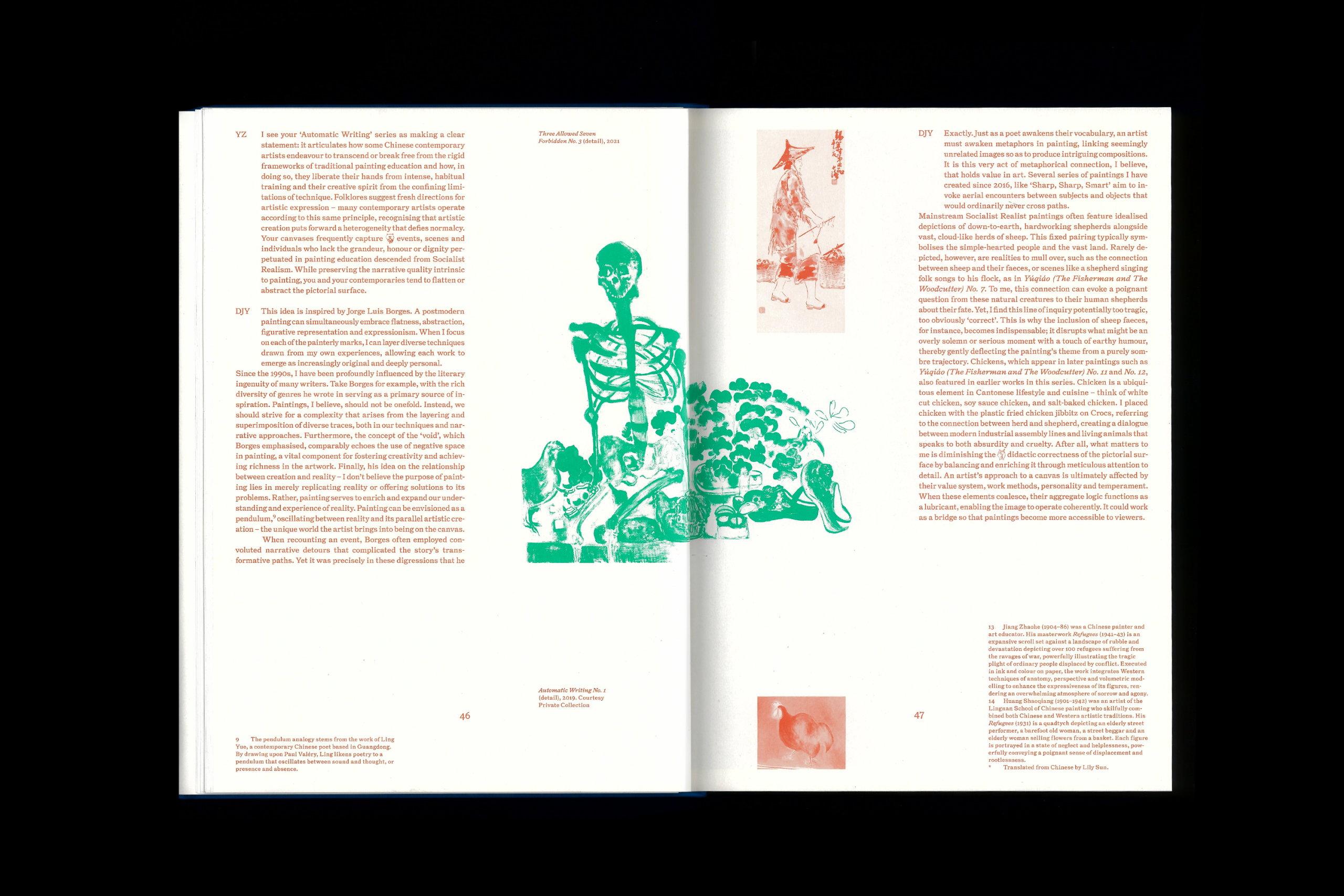 Duan Jianyu: Yúqiáo is the first English-language catalogue dedicated to the Guangzhou-based artist. It accompanies her first major UK solo exhibition in more than a decade and the inaugural programme at the London-based non-profit project space YDP (Yan Du Projects, 4 October–20 December 2025). The catalogue features twenty new paintings that reimagine yúqiáo—a classical Chinese motif of a fisherman and a woodcutter as wise, reclusive figures—into Duan's shape-shifting characters: goats, cows, a black cat detective, and the artist herself, revealing quiet wisdom, humour, and vitality in daily life. Functioning as a parallel dialogue to the exhibition, the catalogue sits between conventional documentation and an artist's book, echoing Duan's distinctive narrative approach and inviting readers to drift through the textures of her imaginative world. Creative writings by Yang Zi and Bang Wang, an essay by Lydia Yee, and a conversation between Duan and Yang offer multiple perspectives on the artist's practice, rooted locally yet resonant globally.