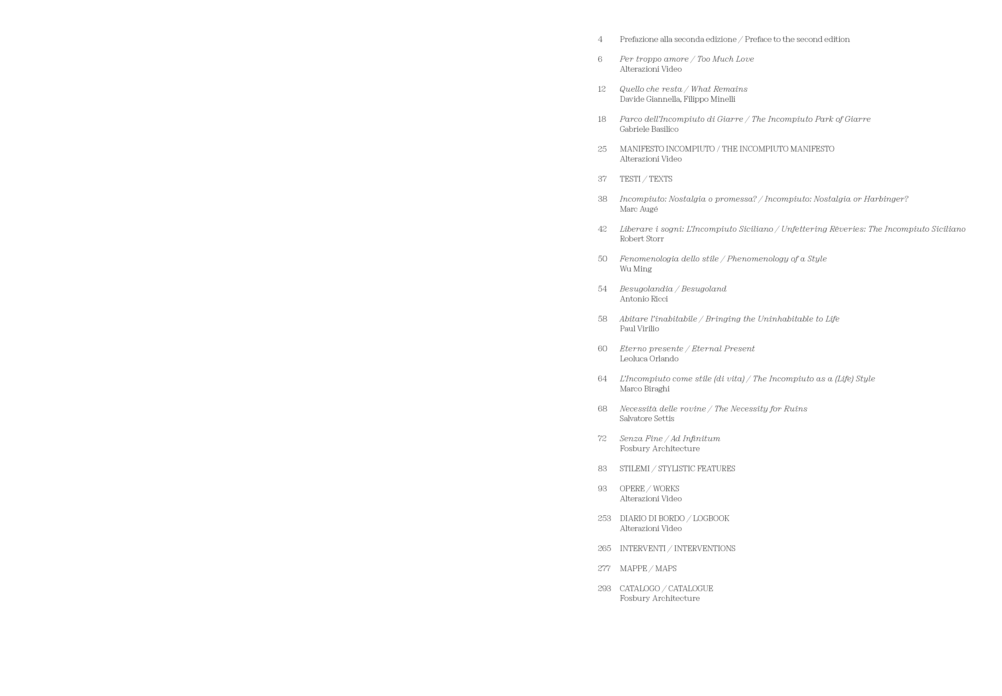présente une étude collective pionnière consacrée au phénomène des constructions abandonnées en Italie. L'ouvrage comprend des contributions de Salvatore Settis, Robert Storr, Marc Augé,