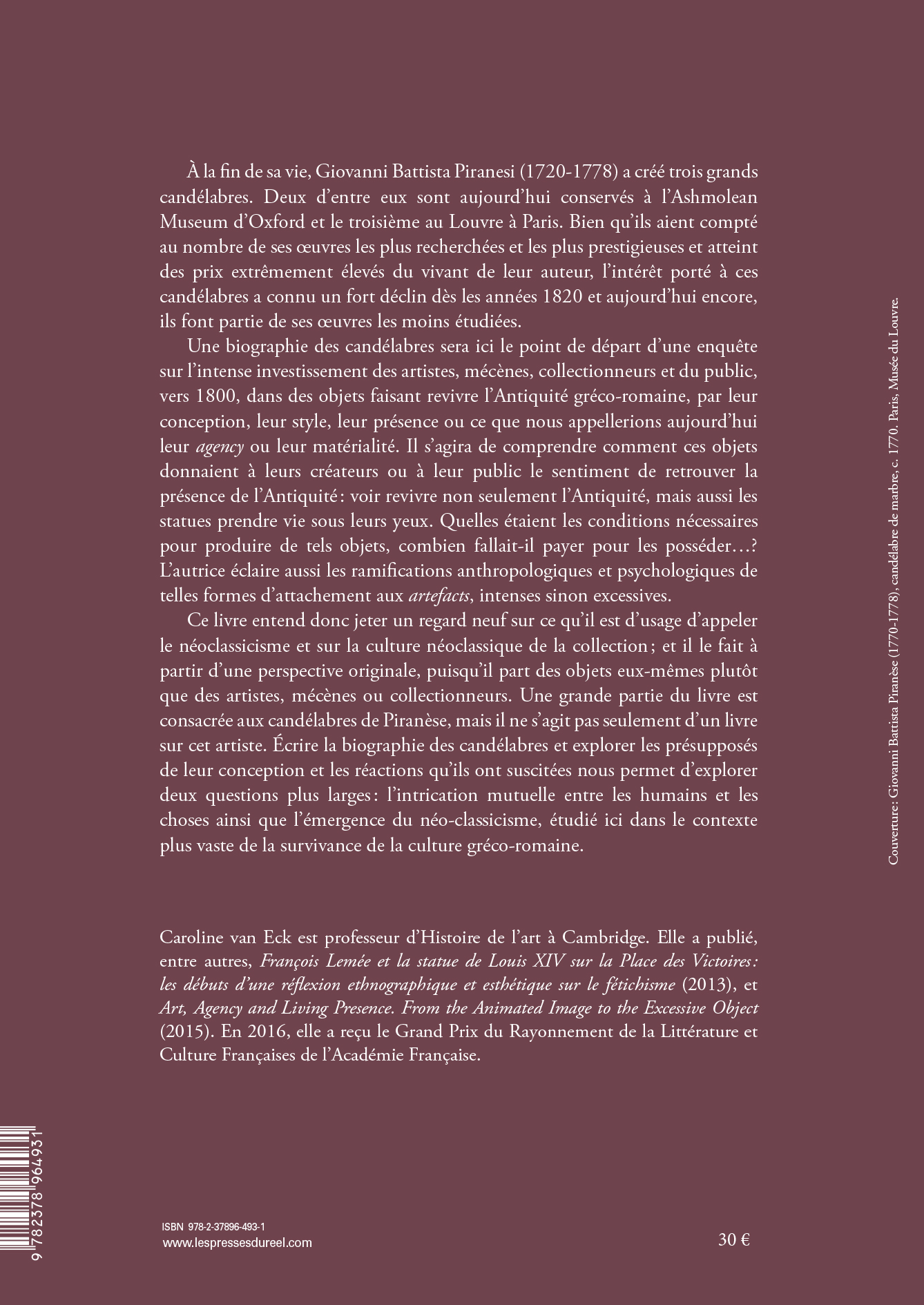 En retraçant l'histoire de trois candélabres colossaux fabriqués par Piranèse (1720-1778) à partir de débris de sculptures romaines antiques, Caroline van Eck nous initie au trajet compliqué des objets d'art depuis leur production jusqu'à leur réception, et élargit l'horizon des études sur le néo-classicisme en expérimentant l'efficacité des méthodes anthropologiques, isolant ce qui relève de la marchandisation des objets d'art et de leur singularisation.