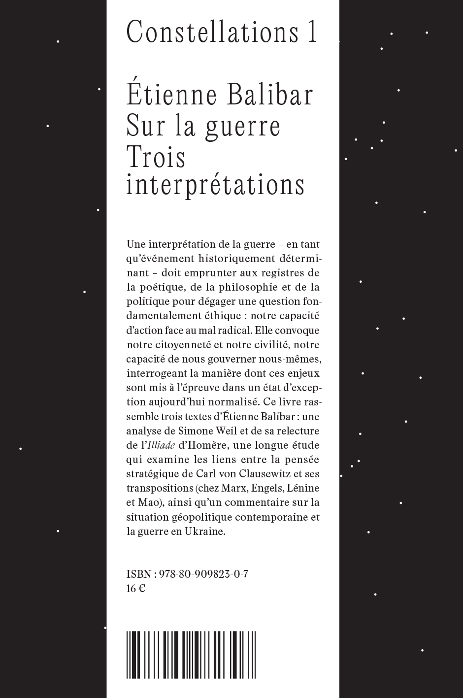 Sur la guerre, volume qui inaugure la série de courts essais « Constellations », contient trois réflexions d'Étienne Balibar autour de la guerre, qui sont d'une actualité brûlante. Le livre rassemble une analyse de Simone Weil et de sa relecture de l'Illiade d'Homère, une longue étude qui examine les liens entre la pensée stratégique de Carl von Clausewitz et ses transpositions marxistes (chez Marx, Engels, Lénine et Mao), ainsi qu'un commentaire sur la situation géopolitique contemporaine et la guerre en Ukraine.