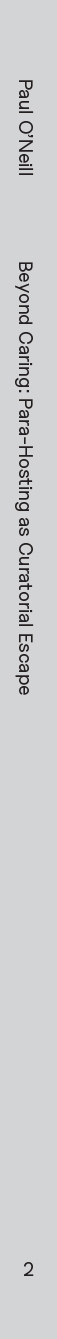 What can established art institutions learn from small-scale organizations' approaches to invitation, hosting, and publicness? In Beyond Caring: Para-hosting as Curatorial Escape, Paul O'Neill explores how new forms of invitation can reimagine host–guest relations and open escape routes from fixed institutional roles. Moving between speculation, critique, and proposition, the essay introduces "para- hosting" as a cooperative methodology of generosity and self-organization without absorption. For O'Neill, para-hosting is a form of escape that enables transformative possibilities beyond existing power structures within institutions and otherwise.