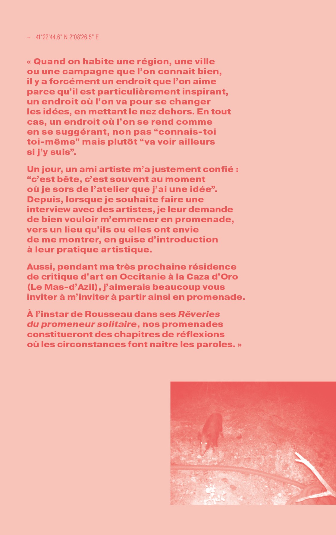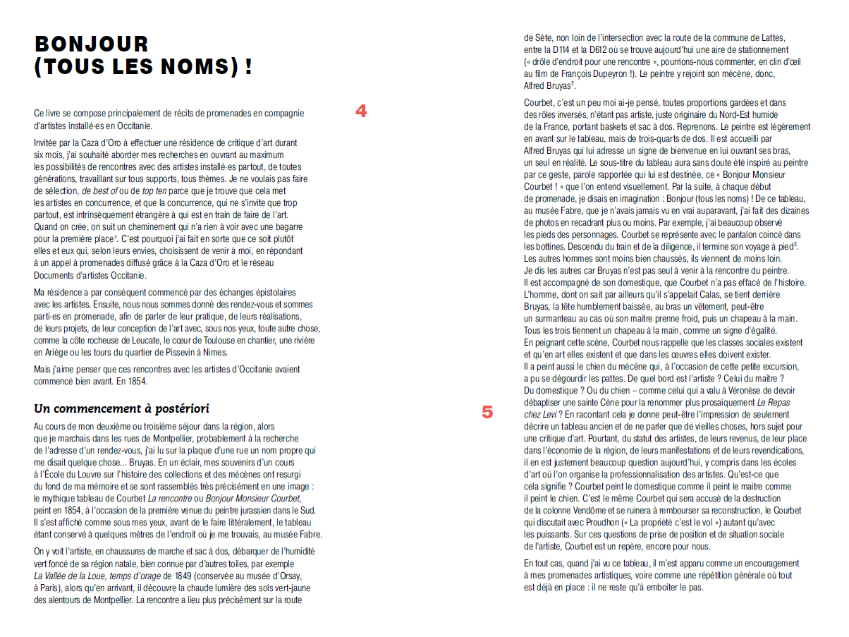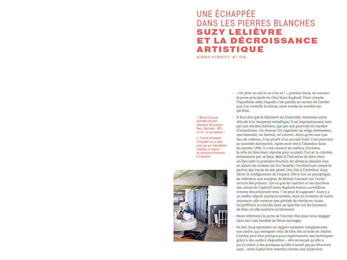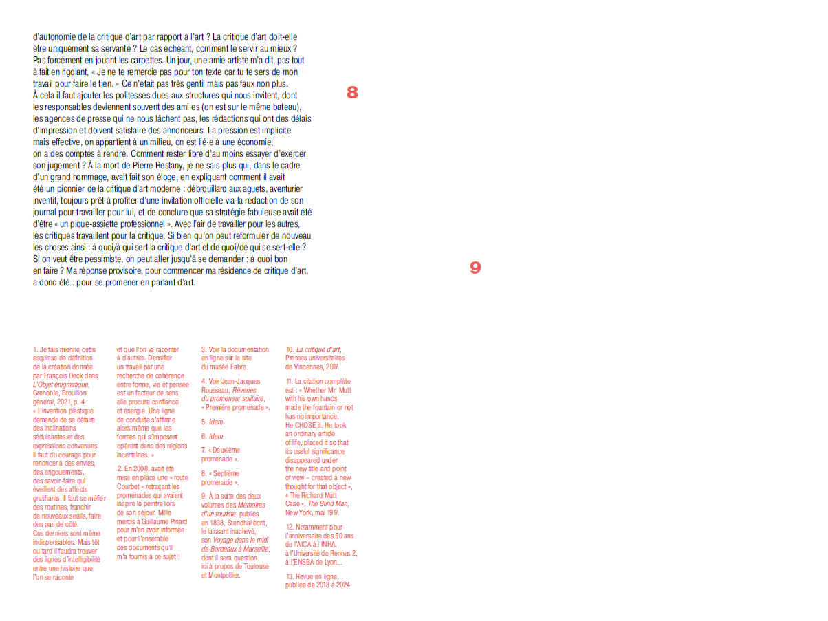 Tel est ce que j'ai souhaité provoquer en proposant à des artistes de se promener : sortir de l'atelier pour sortir du discours convenu entre artiste et critique, qui est un discours de valorisation plutôt que de réflexion. A] minima, il s'agissait de créer des situations dans lesquelles parler d'art autrement, ce qui était d'autant plus possible que nous n'avions pas les contraintes habituelles des publications – formats, délais courts, style...