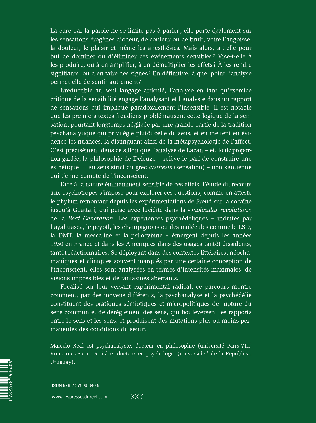 Focalisé sur leur versant expérimental radical, ce parcours montre comment, par des moyens différents, la psychanalyse et la psychédélie constituent des pratiques sémiotiques et micropolitiques de rupture du sens commun et de dérèglement des sens, qui bouleversent les rapports entre le sens et les sens, et produisent des mutations plus ou moins permanentes des conditions du sentir.