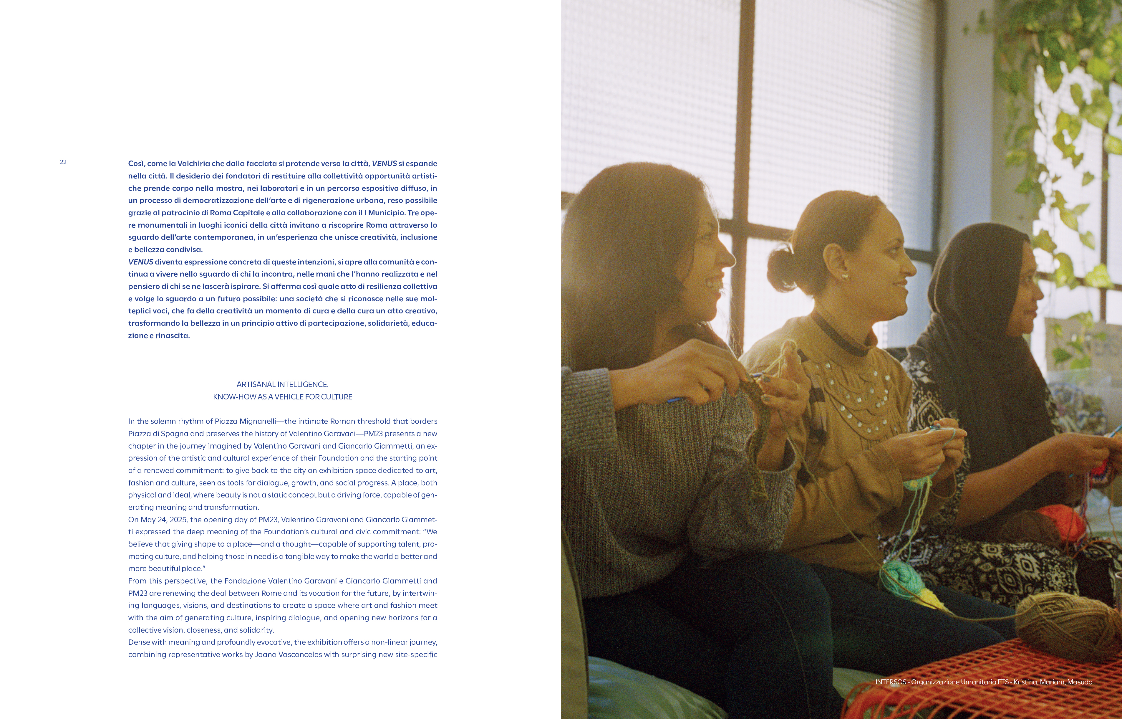 Cet ouvrage est publié à l'occasion de l'exposition VENUS de Joana Vasconcelos à la PM23 (du 18 janvier au 31 mai 2026) et dans certains lieux publics de Rome. Il a été développé en dialogue avec l'œuvre et l'héritage de Valentino Garavani et produit par la Fondazione Valentino Garavani e Giancarlo Giammetti. Conçue comme une fondation philanthropique dédiée à l'éducation, à la culture et à l'engagement social, la fondation envisage le projet non seulement comme une exposition, mais aussi comme une plateforme où convergent l'art, la mode et la participation civique. VENUS aborde le travail de Valentino comme une archive matérielle et conceptuelle. Ses formes, ses couleurs et ses techniques sont traduites en sculptures à grande échelle et en environnements spatiaux qui étendent la mode au domaine de l'installation et de l'espace public. Au centre du projet se trouve Valkyrie Venus, une figure monumentale assemblée à partir de milliers de modules crochetés et textiles produits grâce à un vaste réseau participatif impliquant des écoles, des hôpitaux, des refuges pour réfugiés, des refuges pour femmes et des prisons. Le livre documente à la fois ce processus collectif et l'œuvre achevée, présentant l'artisanat comme une pratique sociale fondée sur l'attention, la répétition et le travail partagé.