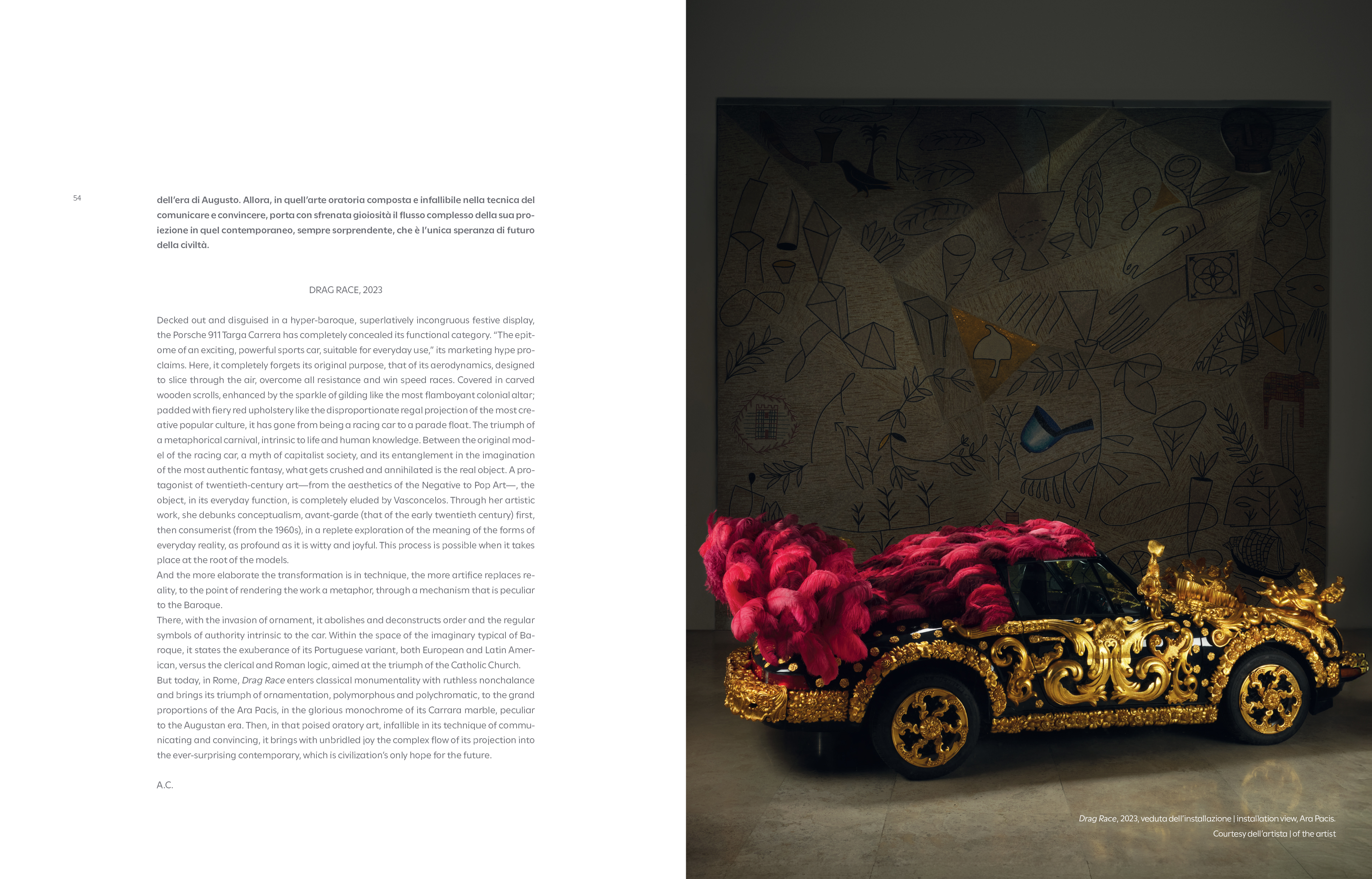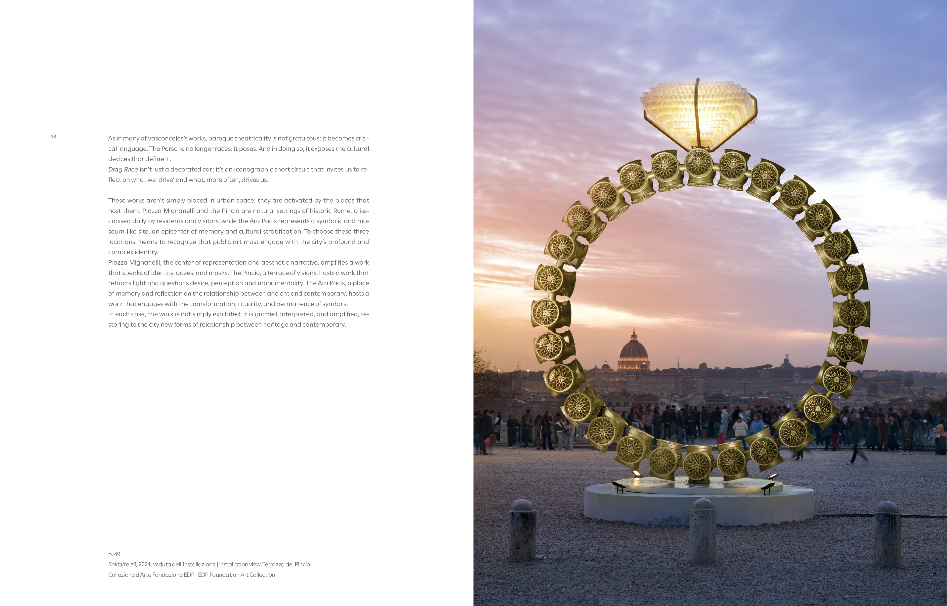 Édité par Pamela Golbin, avec des textes de Pamela Golbin, Anna Coliva, Giulia Silvia Ghia, Daniele Luchetti et Lucia Milazzotto, cet ouvrage combine des essais critiques, une documentation visuelle et des éléments narratifs qui situent le travail de Vasconcelos dans le paysage historique et symbolique de Rome et dans des réflexions plus larges sur l'ornement, le baroque et la politique de l'exposition. Un projet spécial de Daniele Luchetti, développé spécifiquement pour le livre, prolonge l'exposition dans une dimension cinématographique et testimoniale parallèle, enregistrant les voix et les expériences des communautés impliquées et ancrant le projet dans une réalité sociale.