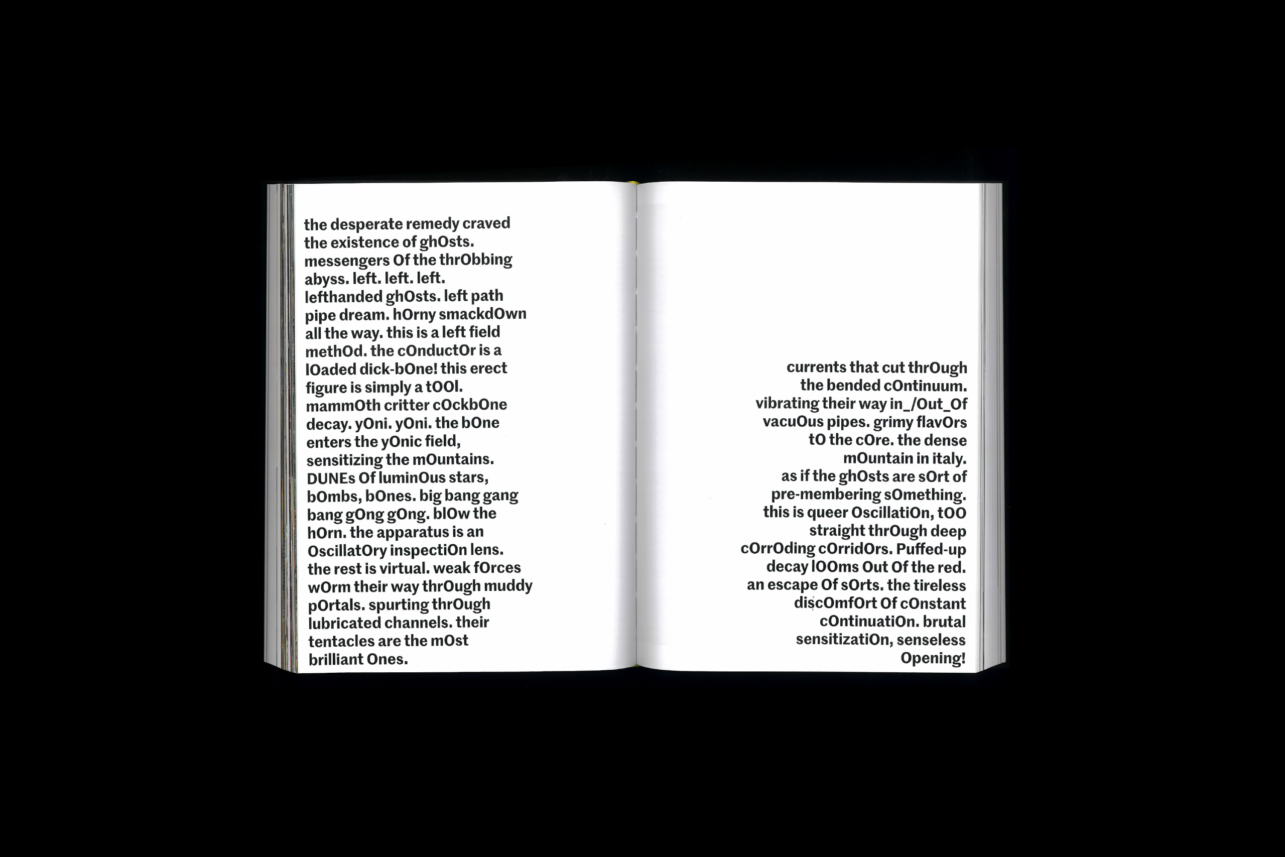 Far from explanatory, the book takes form as glossolalic outbursts, in which particles, bodies, and terrains alike turn into erogenous zones and sites of sensitization. It also contains traces of correspondences and conversations, as well as texts by Lars Bang Larsen, Nanna Friis, Sarat Maharaj, and Anne Kølbæk Iversen. The book has been made possible by Porsager's two-year Mads Øvlisen NOVO postdoctoral project Outrageous Intimacy [Spooky Touch at a Distance], hosted by The Royal Danish Art Academy, Copenhagen (2023–25), in collaboration with Arts at CERN.