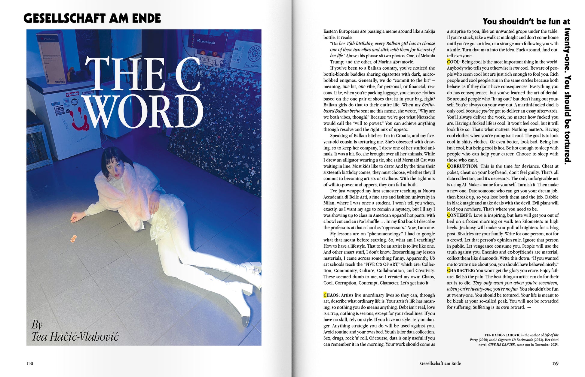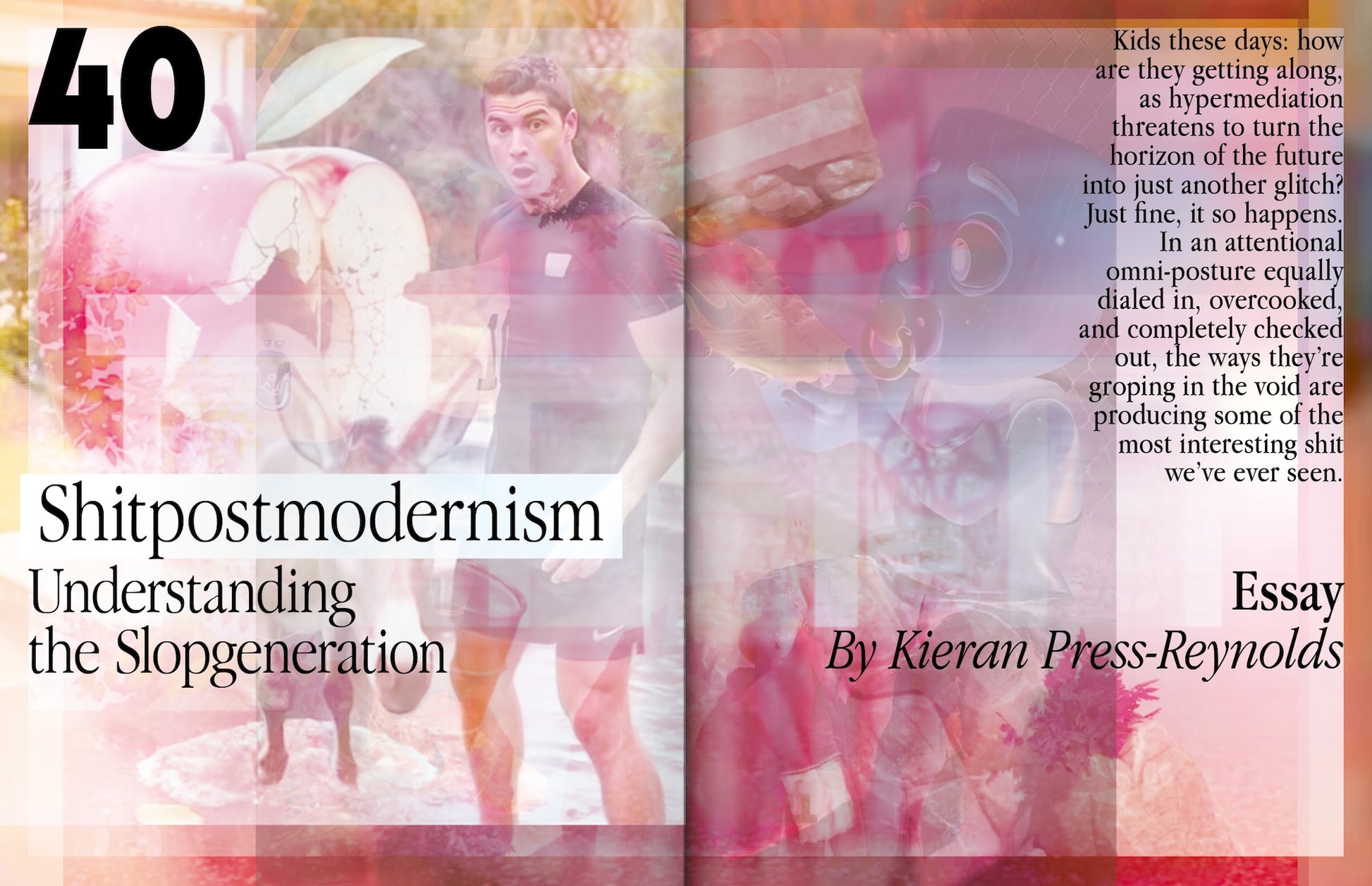 Avec un guide Zoomer sur la génération Slop ; un essai sur la jeunesse dans le monde de l'art à l'ère d'Instagram ; un aperçu des enfants gâtés de l'art contemporain ; une analyse réaliste de l'obsession de la culture pour la jeunesse et la mort prématurée ; des portraits du sculpteur couturier Tenant of Culture, du photographe Rene Matić, nominé au prix Turner, du sculpteur Brian Oakes, qui utilise des déchets électroniques, et du peintre autrichien Lukas Posch ; des parodies de l'étrangeté extatique de la fiction pour adolescents et des promesses politiques des jeunes quakers ; une critique de la Silicon Valley sur l'industrialisation de la prise de risques chez les jeunes ; la métaphore parfaite de Los Angeles dans l'art ; et une touche de conseils en dernière page : « À vingt et un ans, vous ne devriez pas vous amuser. Vous devriez être torturé. »