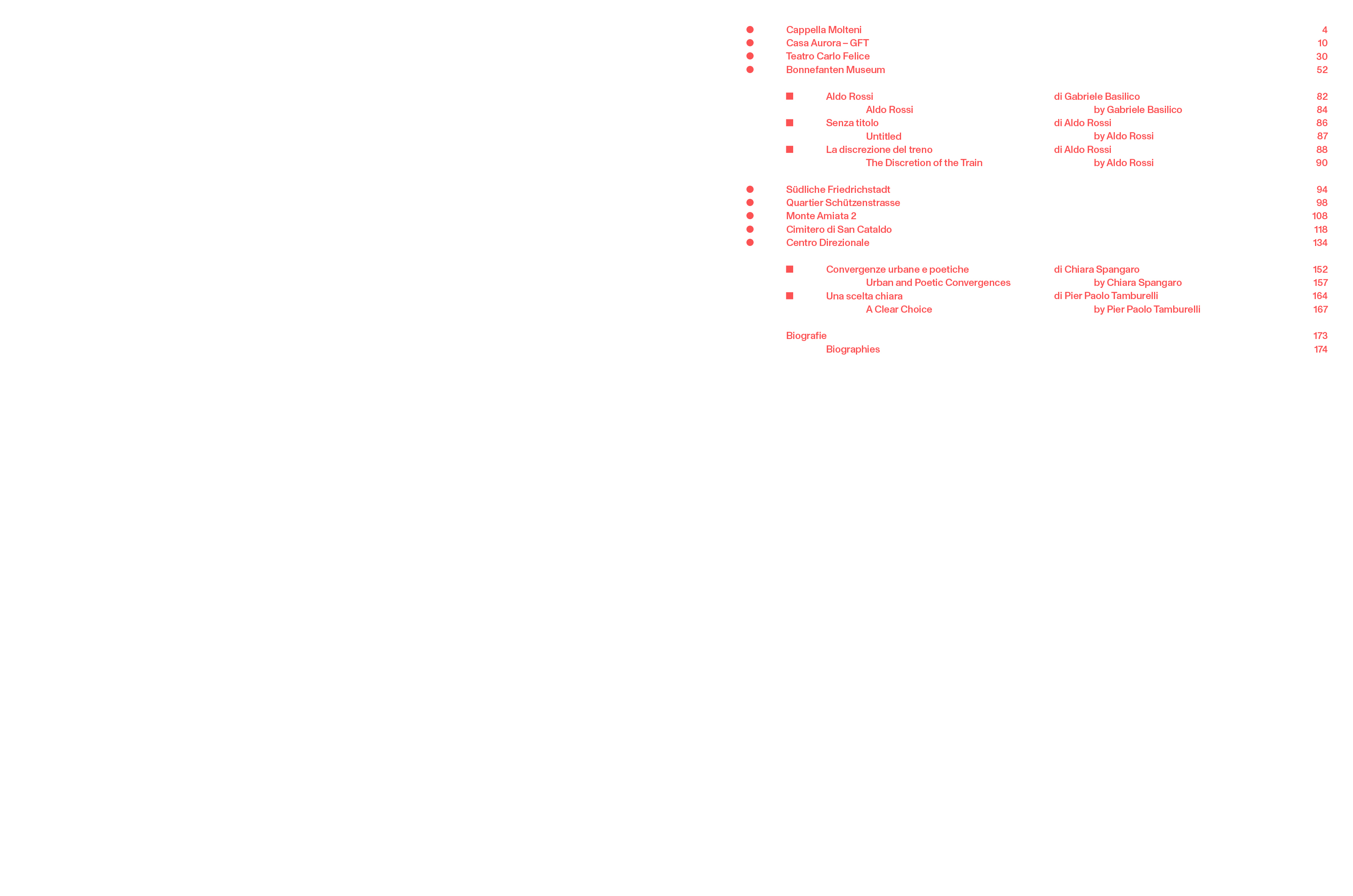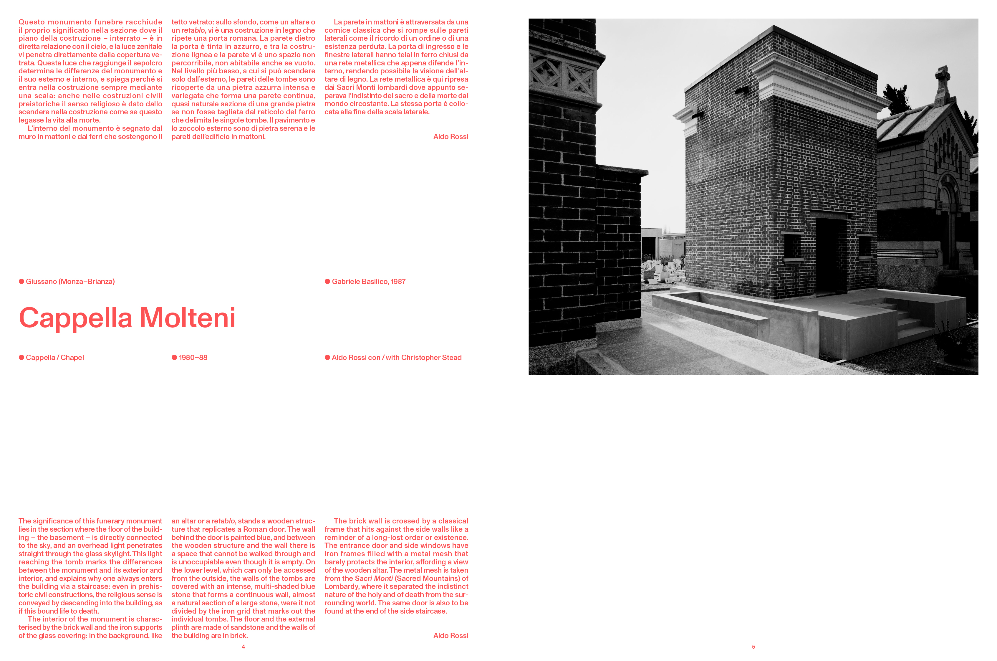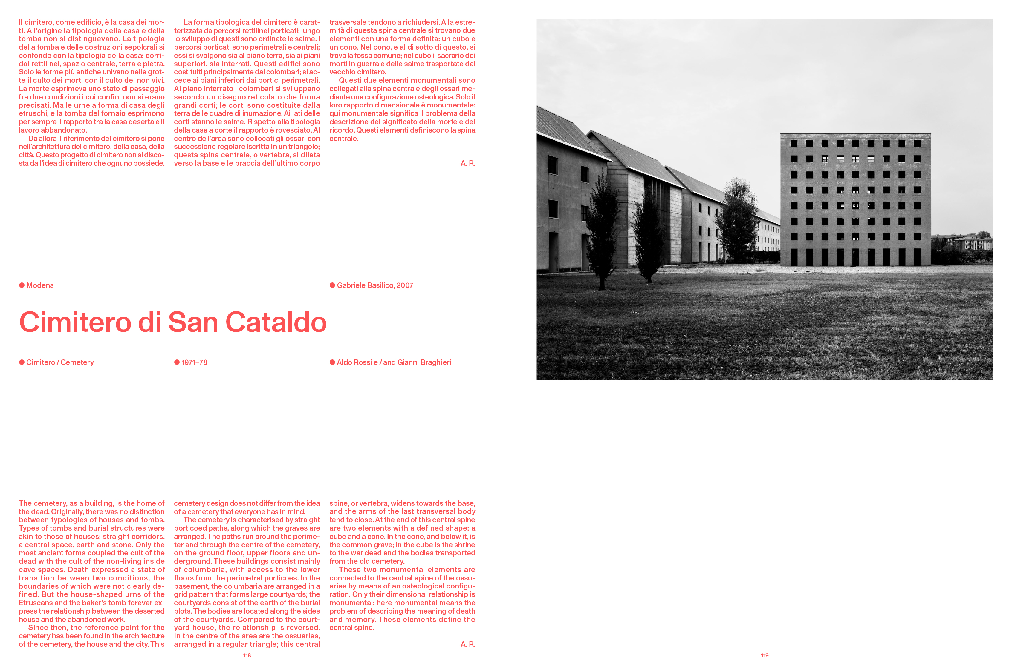 Cet ouvrage rassemble pour la première fois les photographies de Basilico consacrées à l'architecture de Rossi et est enrichi par des contributions de Chiara Spangaro et Pier Paolo Tamburelli, des notes de projet de Rossi, ainsi que des écrits qu'ils se sont dédiés l'un à l'autre.