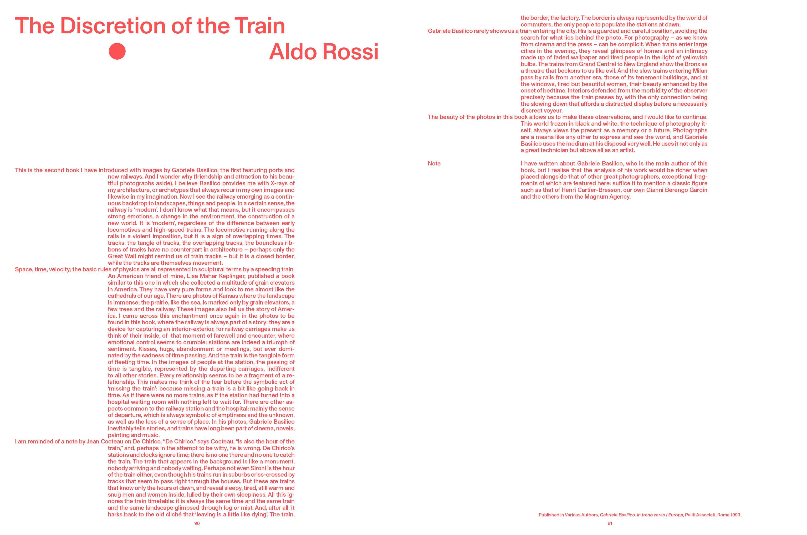 Gabriele Basilico a suivi le travail d'Aldo Rossi pendant près de vingt ans, accompagnant son ascension jusqu'à devenir une figure de proue de l'architecture internationale (il a remporté le prix Pritzker en 1990). Ses photographies révèlent leur profonde affinité professionnelle : tous deux étaient originaires de Milan, diplômés du Politecnico, intéressés par les questions sociales et la transformation urbaine, et surtout, animés par la même conscience morale qui les poussait à explorer le monde qui les entourait. Ayant grandi dans un Milan dont la civilisation industrielle était alors à l'agonie, ils ont saisi l'occasion de créer un nouveau langage tout en restant attentifs à la tradition.