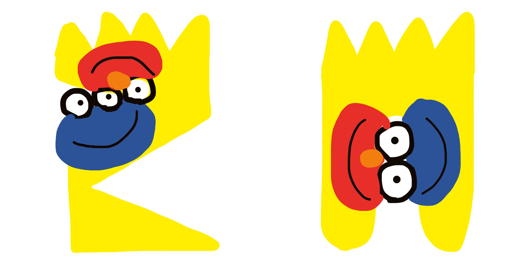 Les portraits déformés créés par Ken Kagami qui combine Bart Simpson avec les personnages de Sesame Street Elmo et Cookie Monster.