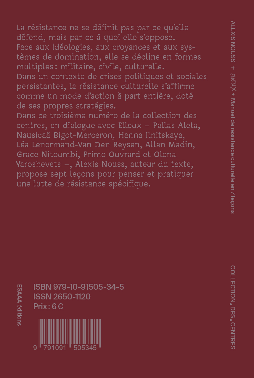 La résistance ne se définit pas par ce qu'elle défend, mais par ce à quoi elle s'oppose. Face aux idéologies, aux croyances et aux systèmes de domination, elle se décline en formes multiples : militaire, civile, culturelle. Dans un contexte de crises politiques et sociales persistantes, la résistance culturelle s'affirme comme un mode d'action à part entière, doté de ses propres stratégies. En dialogue avec Elleux – étudiant·es de l'École supérieure d'art Annecy Alpes (Pallas Aleta, Nausicaä Bigot-Merceron, Hanna Ilnitskaya, Léa Lenormand-Van Den Reysen, Allan Madin, Grace Nitoumbi, Primo Ouvrard et Olena Yaroshevets), Alexis Nouss, auteur du texte, propose sept leçons pour penser et pratiquer une lutte de résistance spécifique.