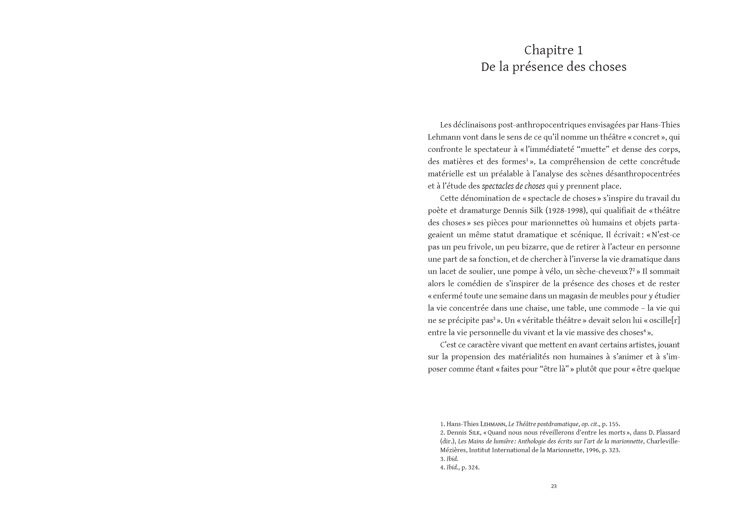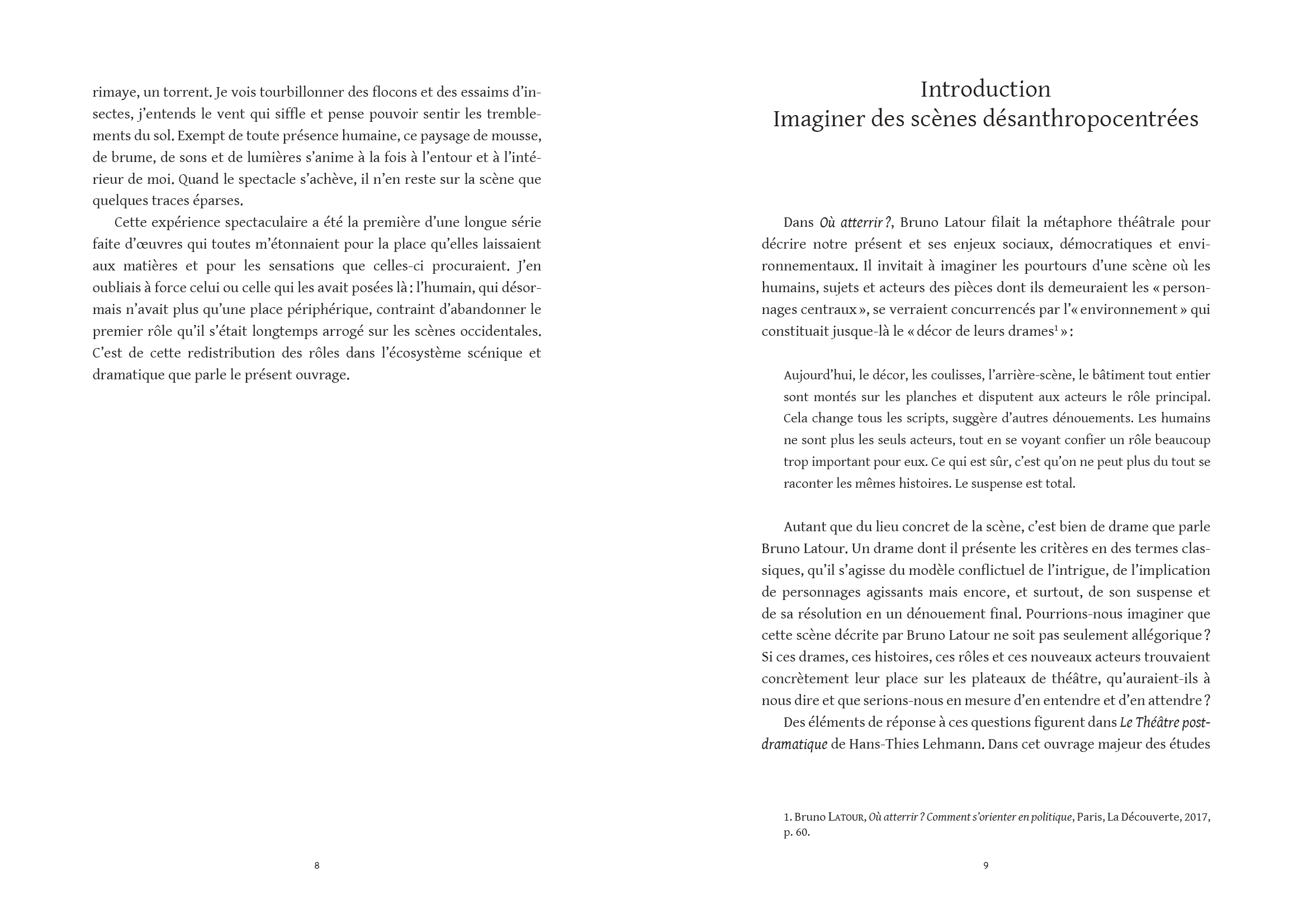De la brume, de l'eau, des automates, des pierres, des tissus, de la mousse, du bois, des aimants, un oiseau, des astéroïdes, des miroirs, une abeille… Une multitude d'existences non humaines peuple les scènes contemporaines. Aux côtés, voire à la place des interprètes humains, elles quittent leur rôle d'accessoire ou de décor pour devenir des actants à part entière. En suivant une perspective écopoétique, Emma Merabet explore les renouvellements scéniques et dramaturgiques liés au décentrement de la présence humaine dans plusieurs œuvres théâtrales et chorégraphiques présentées en France ces quinze dernières années. Alors que la crise écologique nous oblige à revoir nos manières d'être au monde, les arts vivants peuvent-ils cultiver des formes d'attention et d'action soucieuses des liens qui nous façonnent ?