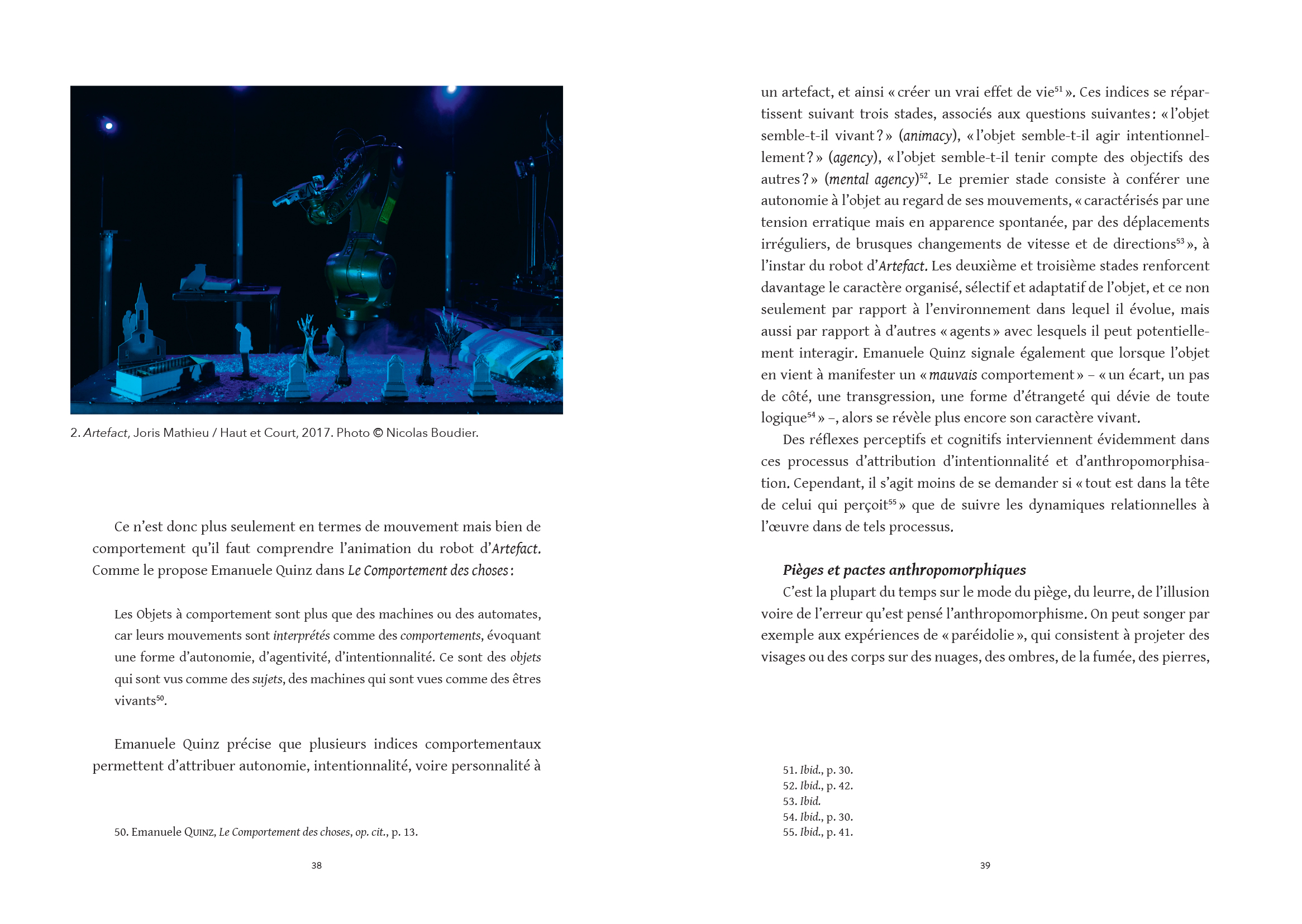 Emma Merabet interroge les formes scéniques désanthropocentrées, où l'humain n'est plus au centre des attentions, et où les éléments non-humains (matières, objets, animaux, machines, phénomènes naturels…) deviennent des présences et des agents à part entière, dévoilant la portée écologique de ces propositions.