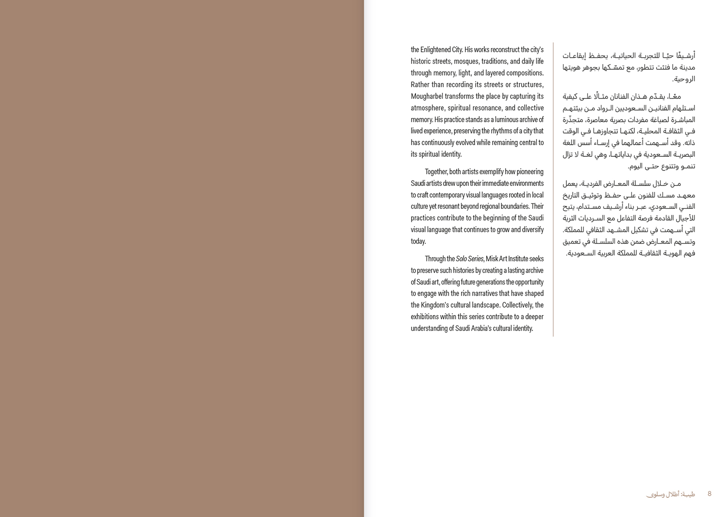 La pratique artistique de Fouad Mougharbel s'ancre dans un attachement de longue date à Médine, l'une des villes les plus saintes de l'islam, où il est né et a grandi. Oscillant entre figuration et abstraction, il développe un langage visuel qui réinterprète l'architecture sacrée de la ville, son tissu urbain historique et ses traditions vivantes. Les œuvres présentées dans ce catalogue se concentrent sur les quartiers historiques de Médine, mettant en valeur les dômes des mosquées, les passages intimes et les scènes de la vie communautaire puisées dans la mémoire et l'expérience vécue. Les peintures de Fouad Mougharbel invitent à une réflexion intérieure sur le lieu, mettant en avant l'importance culturelle et spirituelle de la ville.