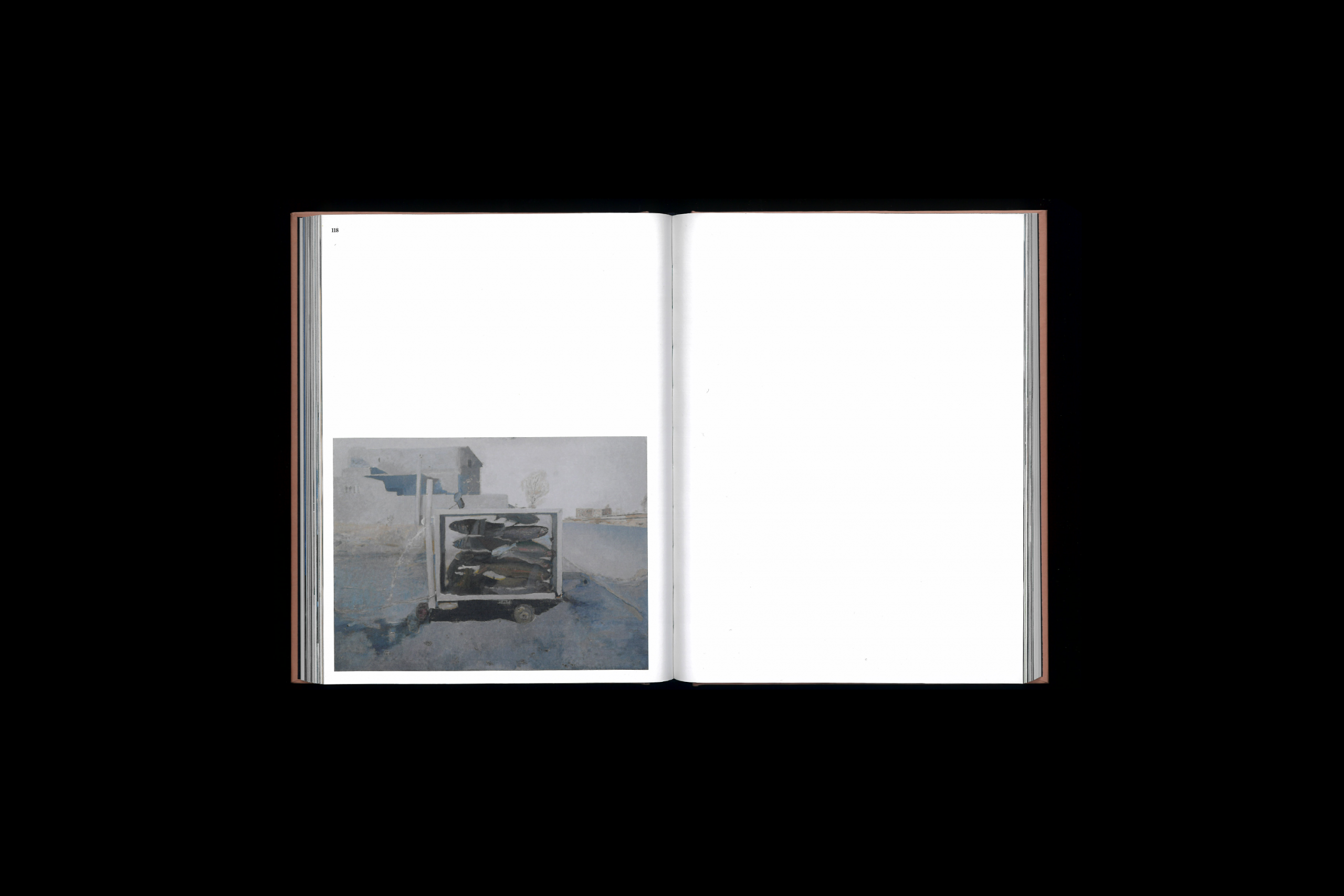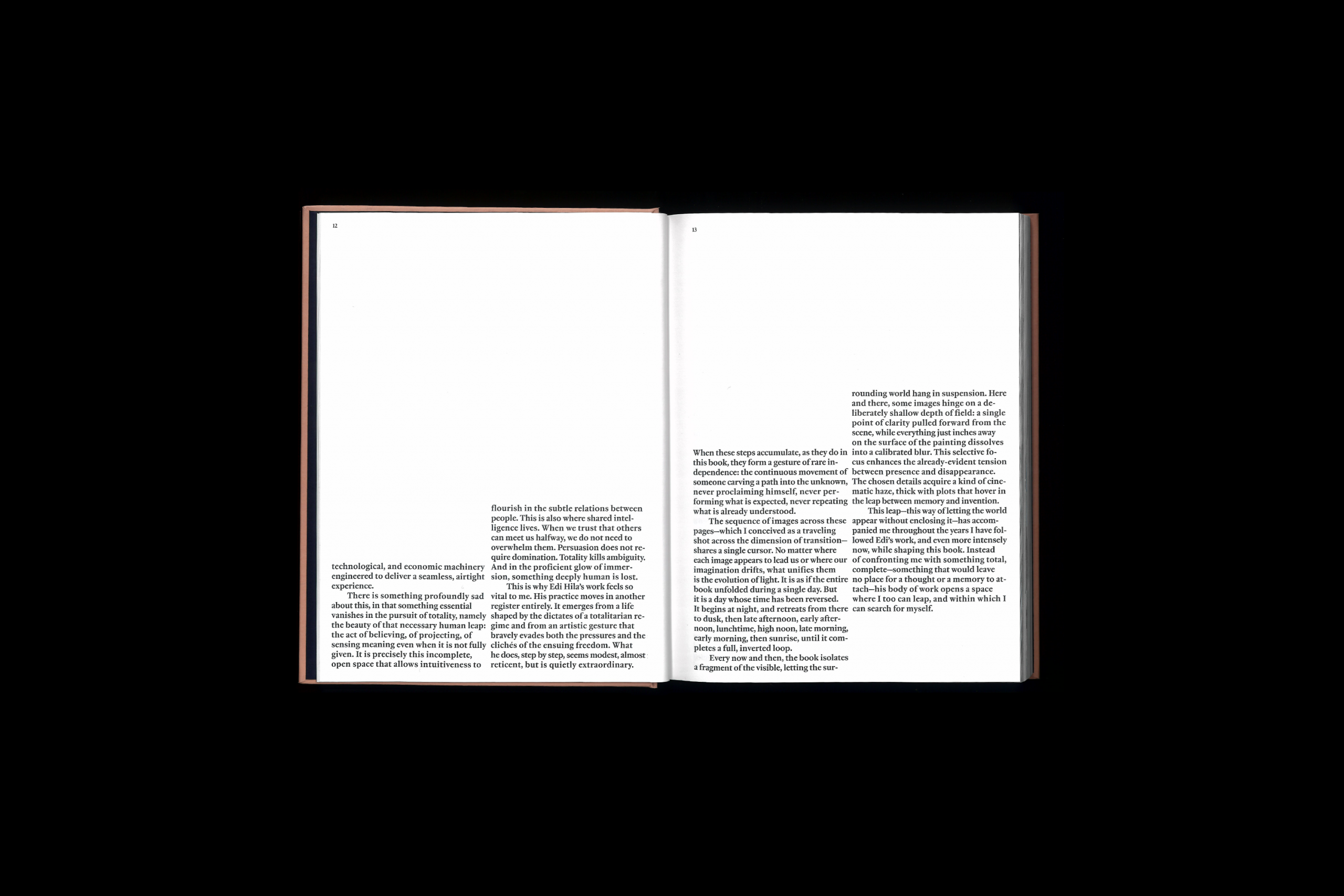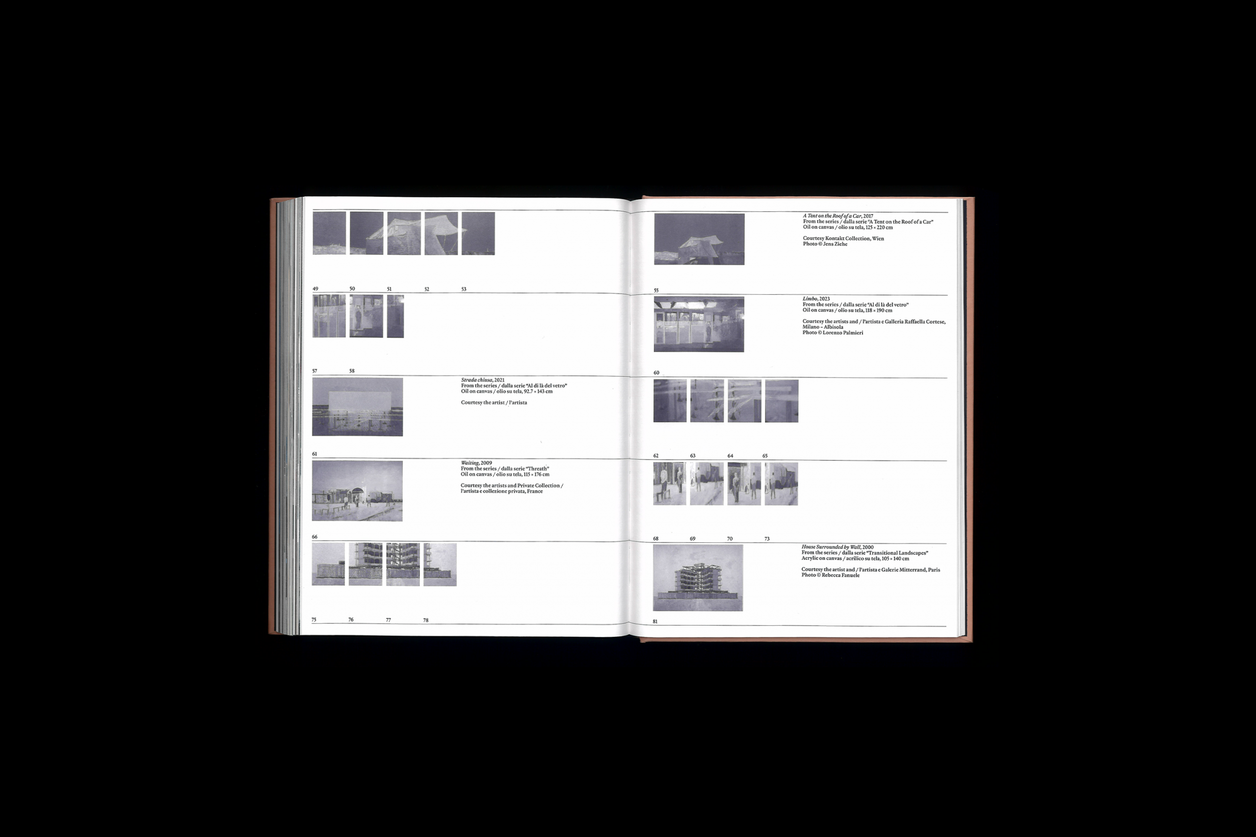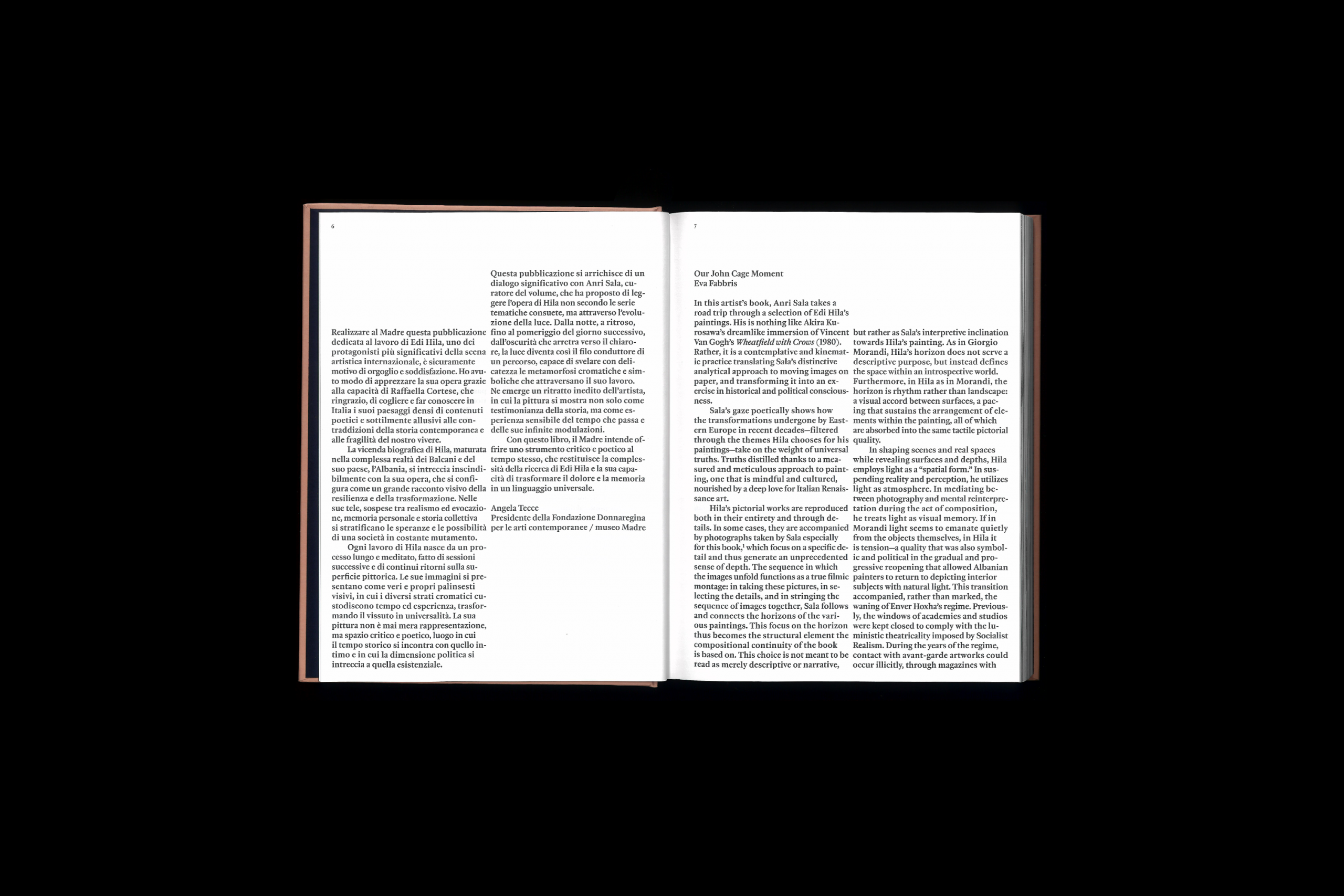 Sala reads the transformations that have marked Eastern Europe—emerging through Hila's paintings—as conditions that may also be understood in broader, even universal terms. This narration unfolds through both full views and selected details, photographed under Sala's direction. The guiding "cursor" of the book is the evolution of light. It is as if the entire publication takes place within a single day—yet a day whose time has been reversed. It begins at night and retreats through dusk, late afternoon, early afternoon, high noon, late morning, early morning, until sunrise, completing a full, inverted cycle.