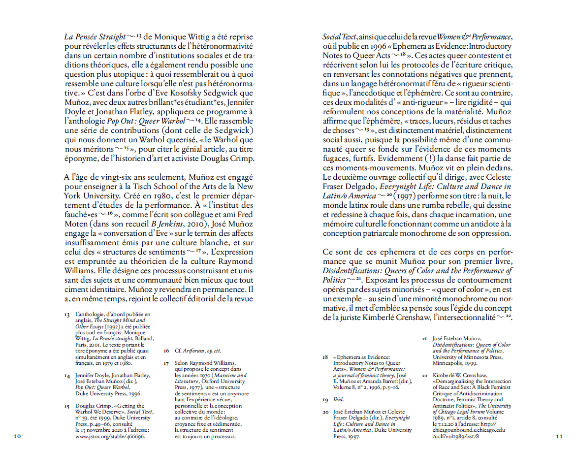 « Fabuleux, extraordinaires, nécessaires, le refus critique d'un pragmatisme queer par Muñoz, son engagement pour la force utopique de la tentative et de l'esthétique radicales, de l'expérimentation érotique et philosophique, sont indispensables à un moment historique caractérisé par la capitulation politique et la timidité intellectuelle qui se font passer pour du courage. »