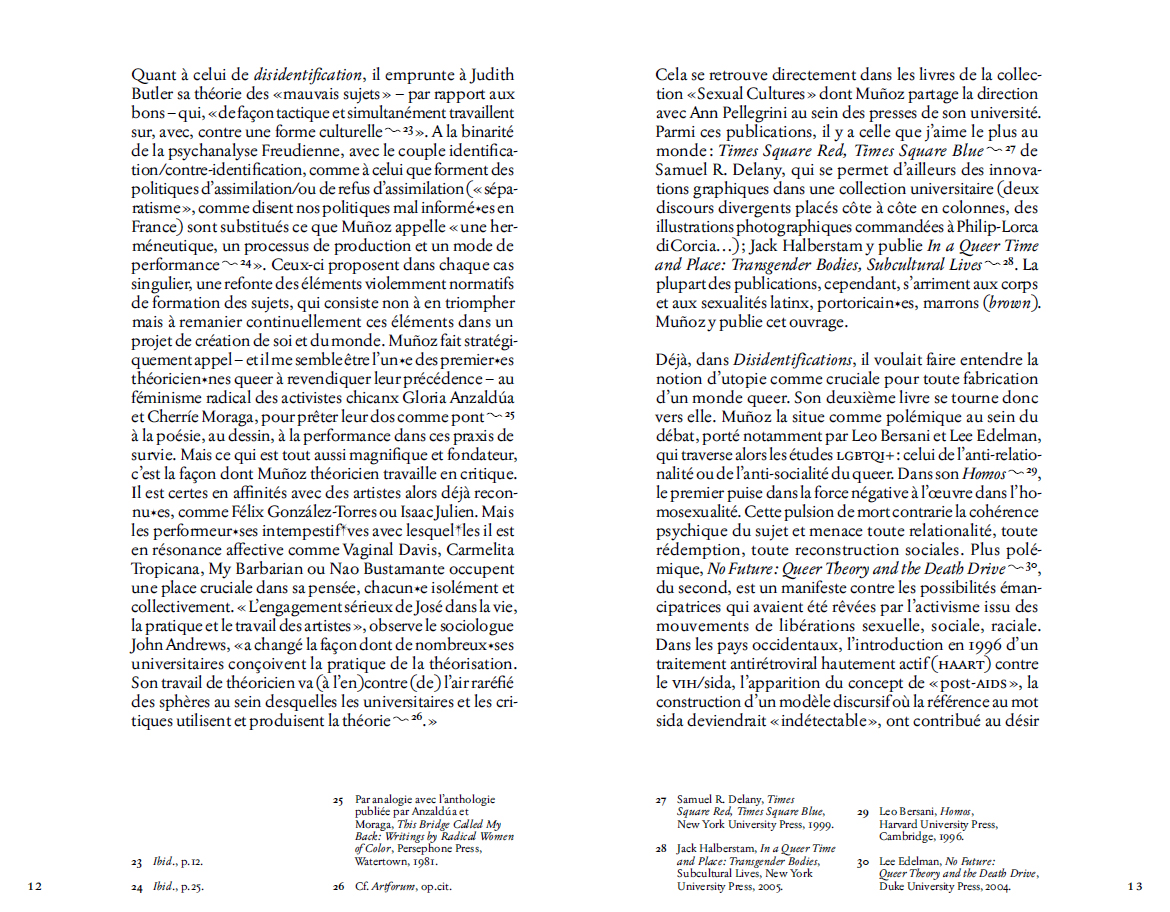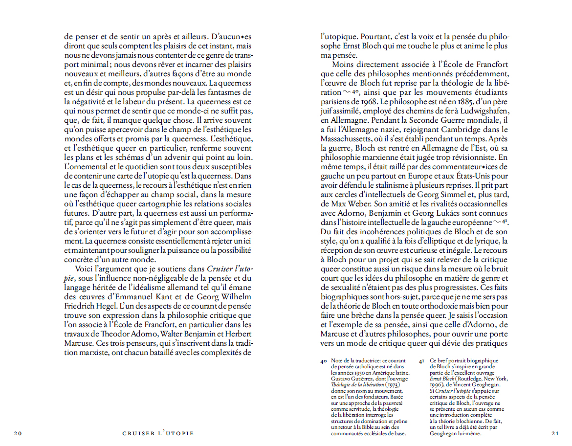 « La queerness n'est pas encore là. La queerness est une idéalité. Autrement dit, nous ne sommes pas encore queer. Il se peut que nous n'atteignions jamais la queerness, mais nous la sentons comme la chaude lumière d'un horizon empreint de puissance. (…) Nous n'avons jamais été queer, pourtant la queerness existe pour nous comme une idéalité que nous pouvons distiller à partir du passé et utiliser pour imaginer un futur. (…) Malgré les représentations totalisantes de la réalité qu'impose l'ici et maintenant, nous devons nous efforcer de penser et sentir un