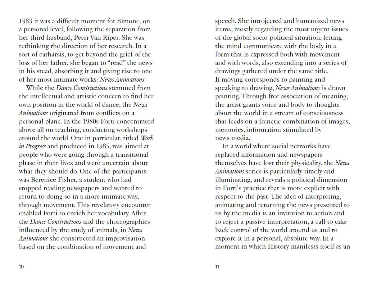 Ce volume rassemble les News Animations de Simone Forti de 1980 à 2018 – à travers les transcriptions des performances, les images et les dessins – en cherchant à saisir leur esprit, leur position poétique et, surtout, à comprendre la manière dont elles décrivent la société et le monde dans lesquels nous vivons.