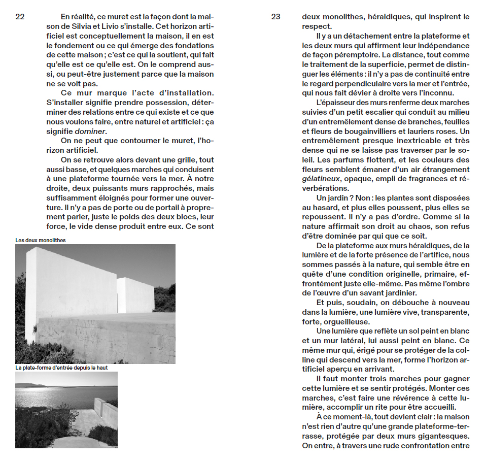 Livio Vacchini : l'historien de l'architecture et de la culture Roberto Masiero lit cette maison, véritable « machine à penser », comme une leçon d'architecture, dans laquelle des questions nouvelles et profondes surgissent (l'essai, publié pour la première fois en Italie en 2017, est complété par une préface de l'architecte Vittorio Gregotti et une postface du philosophe Marco Assennato).