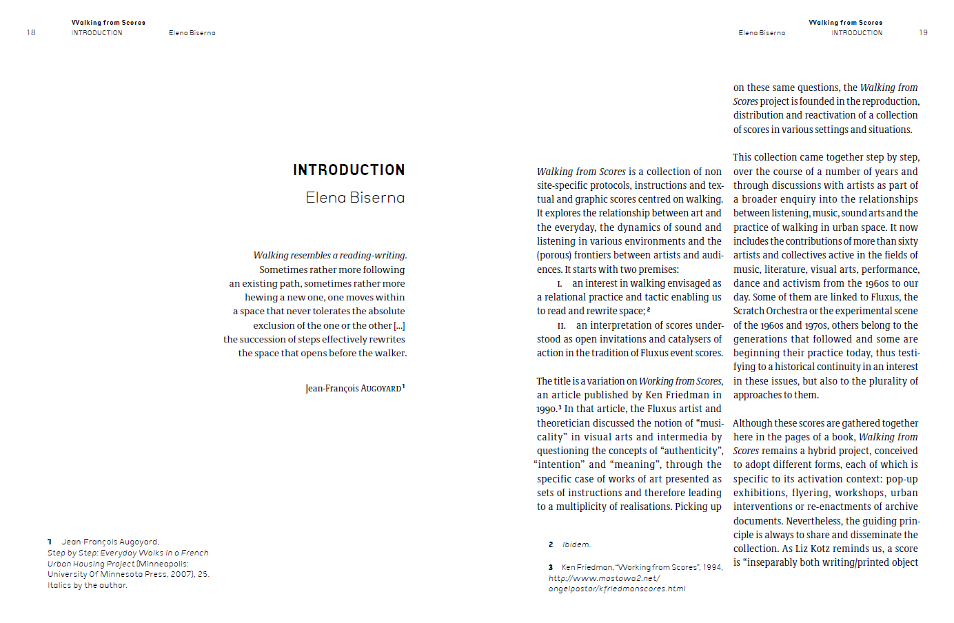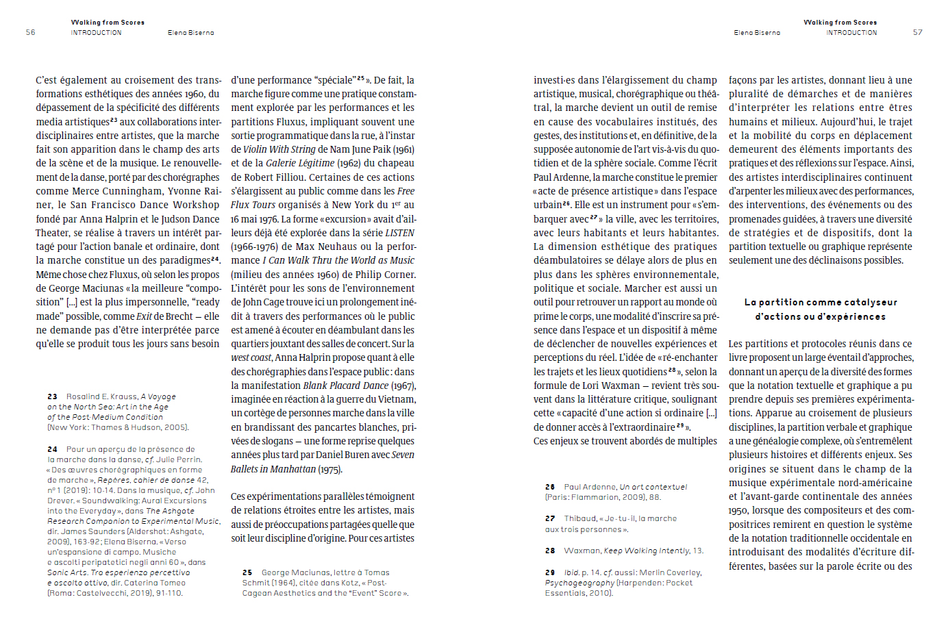 « Ce livre est une incroyable surprise : il existe donc tant de partitions pour la marche ! Avec ces partitions (textuelles ou graphiques)/protocoles/ instructions centrées sur la marche, c'est notre relation à l'environnement qui est interrogée, c'est la frontière entre artiste et public qui est déplacée, la relation entre art et quotidien qui est favorisée. Et derrière, c'est l'écoute qui est questionnée. Et si vous n'aimez pas marcher, c'est une véritable mine de propositions d'écriture de partitions hors du système traditionnel occidental. »
